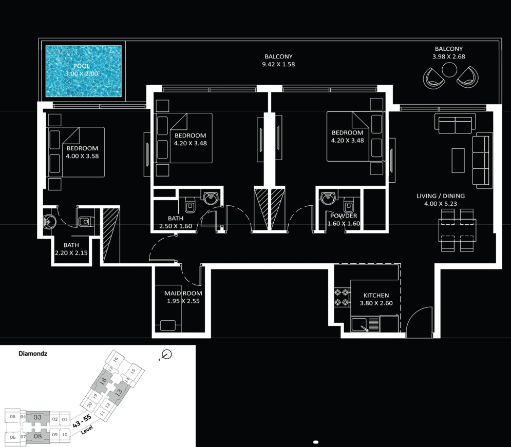 The hallmark of Diamondz is the fusion of opulence and innovation. Each unit - from chic studios to grand 4-bedroom apartments - features premium finishes, with many boasting private pools on the balcony. It serves as a perfect sanctuary for professionals and investors, blending the serenity of lakefront views with the dynamic energy of a premier urban hub.